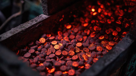 A vibrant view of glowing charcoal embers in a traditional forge, highlighting the intense heat and craftsmanship involved in metalworking processes.