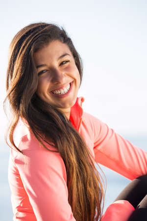 woman, portrait smile or fitness at the beach in a workout or sports training exercise with mockup space