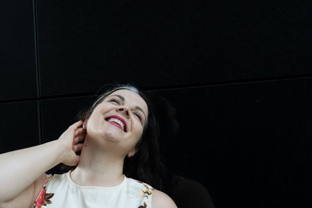 Portrait of 40s plus size woman happily smiling outdoor in a city