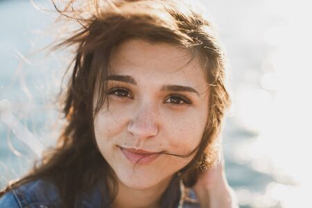 Portrait of a young woman on a blurred background of the sea.