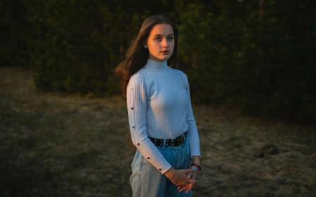 Sweet teenage girl catches sunset light in the forest
