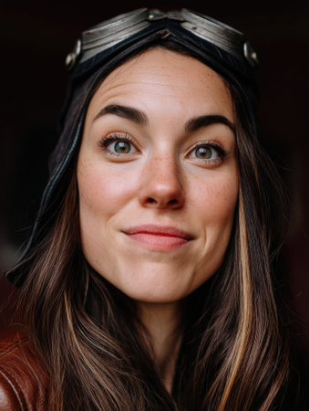 Smiling woman wearing aviator goggles and leather cap.