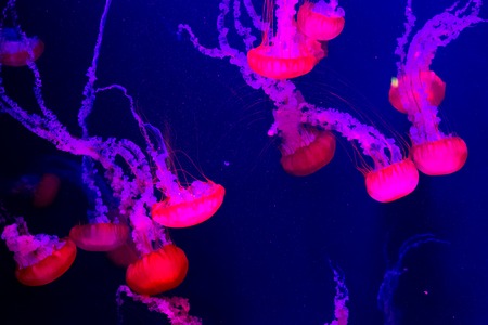 Macro shooting of neon jellyfishes in aquarium