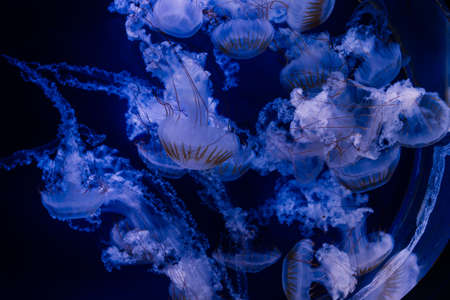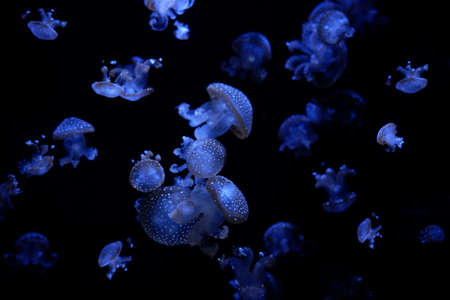 Group of Sanderia Malayensis, Amakusa Jellyfish swimming in aquarium pool with blue neon light. Theriology, biodiversity, undersea life, aquatic organism