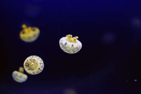 Small jellyfishes illuminated with blue light swimming in aquarium.