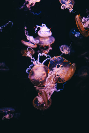 In dark water a group of vibrant jellyfish exhibits their pulsating movement showcasing their ethereal beauty and delicate forms.
