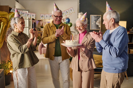 Group of senior Caucasian men and women celebrating birthday, one senior woman holding cake with candles while others clapping and smiling, party hats and decorations visible
