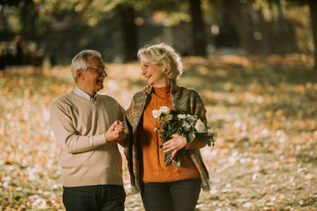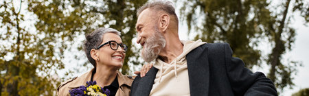A mature couple enjoys a peaceful walk together, sharing smiles and holding vibrant flowers.