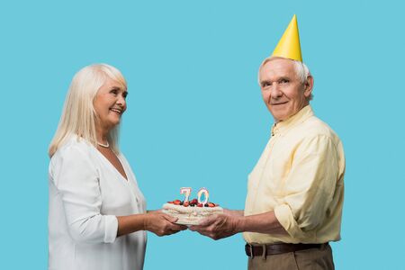cheerful retired man in party cap holding birthday cake near wife isolated on blue
