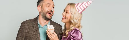 happy woman holding birthday cupcake near cheerful husband with whipped cream on nose isolated on grey