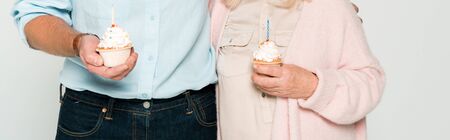 cropped view of senior husband and wife holding birthday cupcakes isolated on grey, panoramic shot