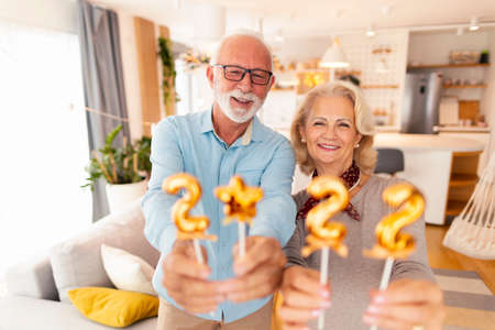 Beautiful senior couple celebrating anniversary with birthday cake - Elderly couple having birthday party at home