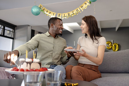 On sofa, African American man and woman sharing birthday cake, smiling warmly. Celebration, happiness, togetherness, diversity, lifestyle, indoors