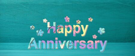 Happy Anniversary alphabet letters decorate with flowers on blue background