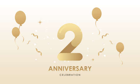 2nd anniversary logo with confetti and golden ring, red ribbon isolated on red background, vector design for greeting card and invitation card.