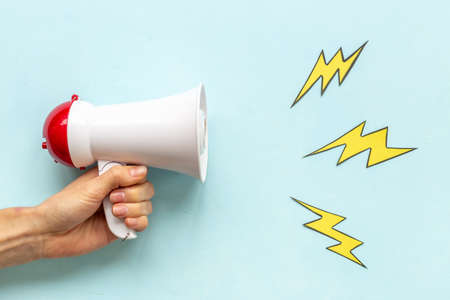 woman s hand showing power thunder with megaphone. High quality and resolution beautiful photo concept