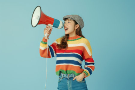 A cheerful young woman in a red sweater, holding a megaphone in her hand, shouts out discount announcements, standing out against a colorful bright background.