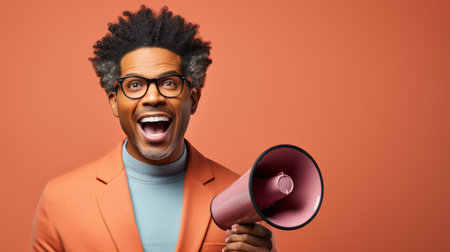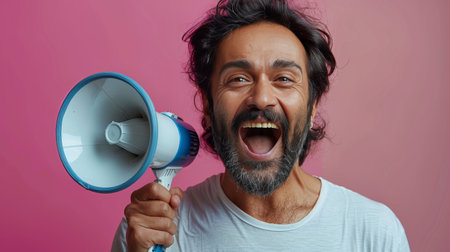 Cheerful man shouting, screaming through a megaphone, announcing something news, announcments concept