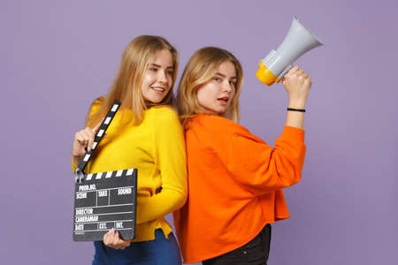 Two beautiful young blonde twins sisters girls hold classic black film making clapperboard, scream on megaphone isolated on violet blue background. People family lifestyle concept. Mock up copy space