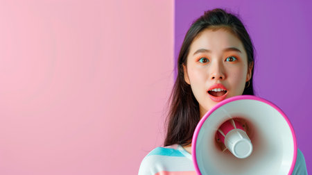 Excited woman shouting through a megaphone over pink and purple background.
