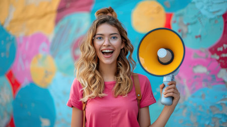 Young woman with megaphone on the background of a colored wall