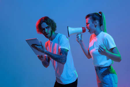 Portrait of young man with tablet and woman shouting in megaphone isolated over blue background in neon light. Concept of youth, lifestyle, relationship, emotions, facial expression, ad