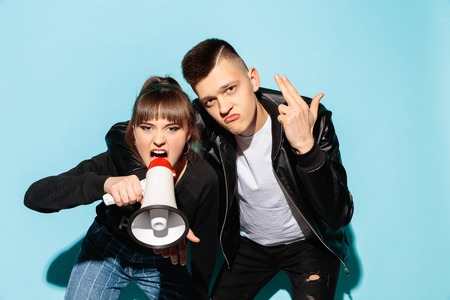 Portrait of young female student in denim clothes holding megaphone and screaming against blue studio background. Two teen friends - man and girl with serious emotion. Education in high school concept. Copy space