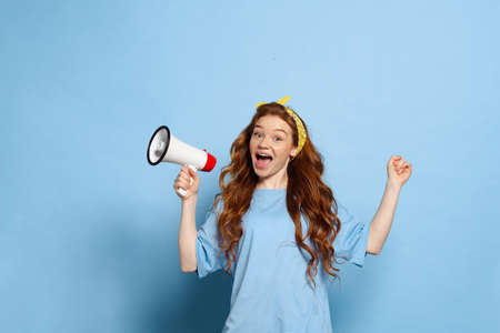 Excited young redhead girl, student shouting at megaphone isolated on blue studio background. Human emotions, facial expression concept. Trendy colors