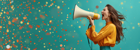 Woman with megaphone projecting colorful abstract shapes against turquoise background