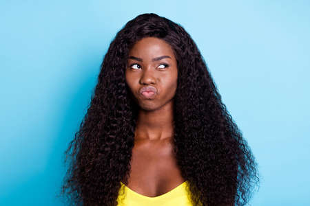 Portrait of attractive wavy-haired girl pouting lips overthinking isolated over bright blue color background