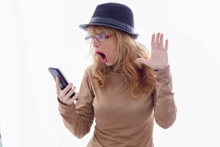 adult woman with hat and mobile phone isolated on white background