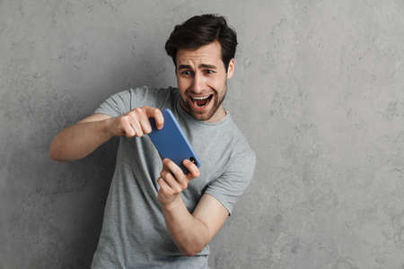 Stressed handsome guy screaming while playing online game on cellphone isolated over grey wall