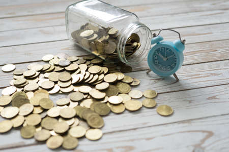 jar of coins with analog alarm clock on vintage wooden table.Financial and investment concept.