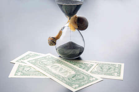 snail crawls on an hourglass against the background of money. speed and stability in increasing income. time for work and rest. financial business success. time investment target