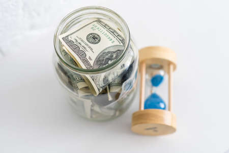 American dollar banknotes in a glass jar on a table, saving money concept with copy space.