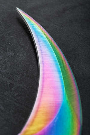 The sharp blade of the Kerambit knife made of steel is multicolored in close-up on a dark background. Cold steel, macro