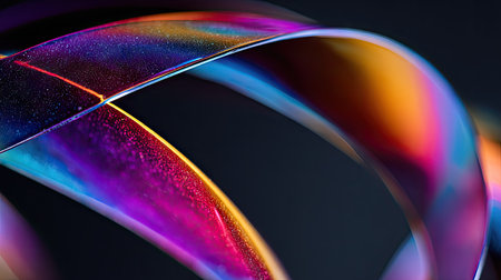 A close-up of glossy, reflective metal shapes and curves in an abstract composition on a white background. The metallic sheen is captured with iridescent, holographic, chromatic colors that create a sense of depth and dimensionality within the frame. This high-definition image showcases intricate details and textures to emphasize its shiny surface and rainbow-like reflections. It's a visually stunning representation of modern design elements in the style of abstract expressionism. --ar 29:15 --v 6.1 Job ID: 6720b107-1e1e-4cc0-a89a-a620e9d080e6