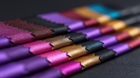 A stunning arrangement of colorful satin ribbons in vibrant shades, showcasing smooth textures and rich colors against a dark background, perfect for creative inspiration.