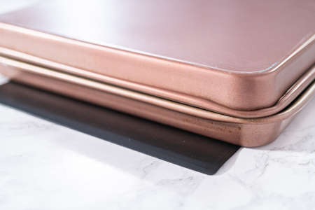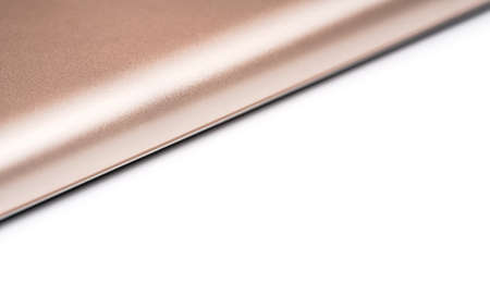 Rose gold colored metal smartphone case, closeup macro detail forming diagonal line with space for text right, abstract technology background