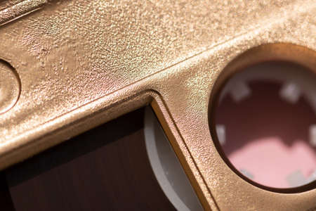 macro detail of gold cassette tape on a pink background with shadow selective focus retro backdrop for your project