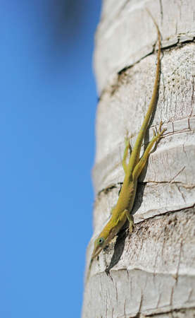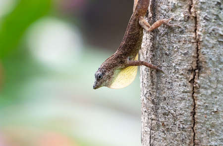 Closeup of brown Lizard hunting on a tree trunk in the Caribbean.