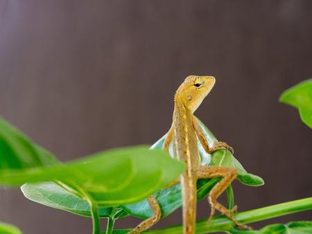 Oriental garden lizard is sitting on the green tropical leaves. Selective focus.