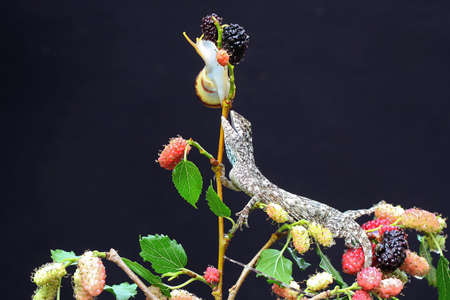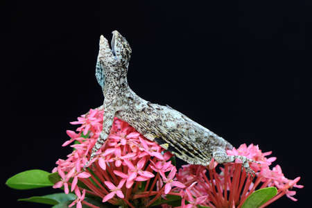 A flying dragon is ready to eat a small snail. This reptile that moves from one tree to another by sliding has the scientific name Draco volans.