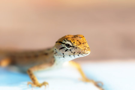 Close up of a lizard on a blue background. Shallow depth of field