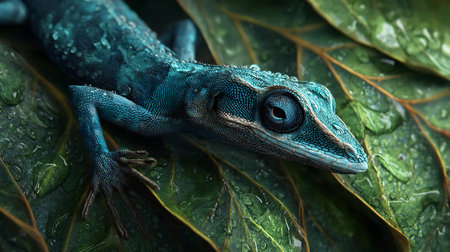 This stunning image captures a lizard resting elegantly on a palm leaf in a vibrant tropical setting. The intricate details of its scales and the lush green surroundings highlight nature's beauty and diversity, creating a tranquil scene ideal for wildlife enthusiasts.