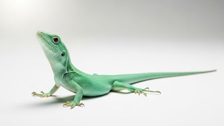 A vibrant green anole lizard strikes a pose against a clean white background in a studio setting, showcasing its unique features and coloration.