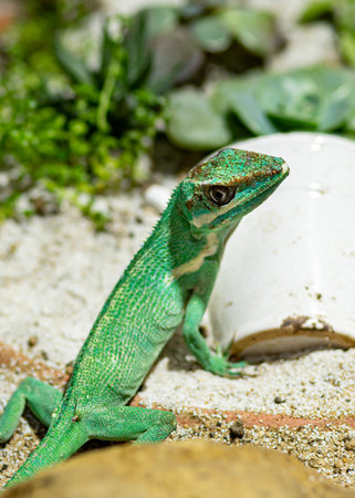 Green lizard on the sand in the garden. Close-up.