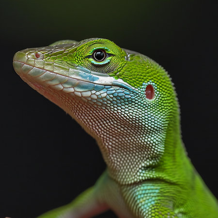 Close-up portrait of a green lizard on a black background.