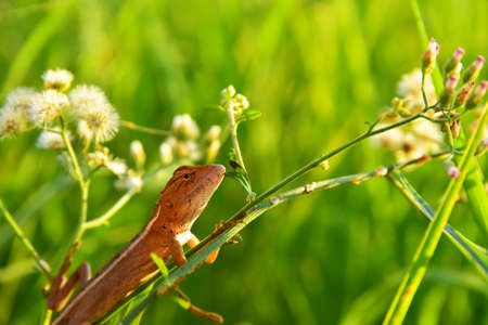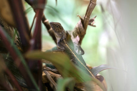 Baby Oriental Garden Lizard (Calotes versicolor) on the leaves. Found widely in Asian countries. camouflage garden lizards. Close up chameleon details.
