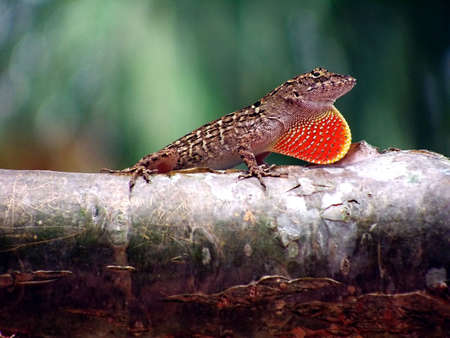 A green anole lizard displaying its vibrant dewlap, attracting mates and asserting its dominance in the territory.